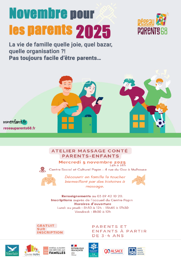 NOVEMBRE POUR LES PARENTS - Atelier massage conté parents-enfants : mercredi 5 novembre de 14h à 16h au Centre Social et Culturel Papin (4, rue du Gaz à Mulhouse) - inscription sur place