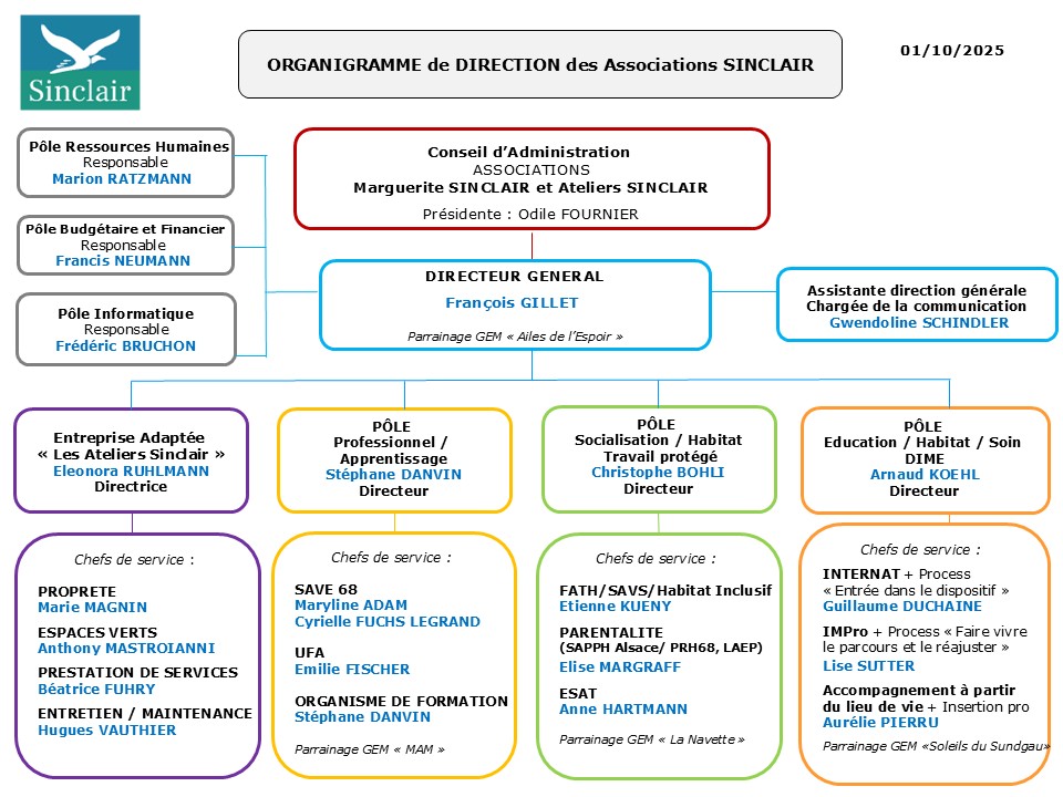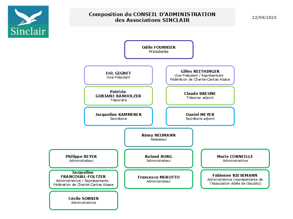 Le Conseil d’Administration des Associations Sinclair est composé de 14 membres. Sa présidente est Madame Odile Fournier. Le Conseil se réunit au moins 4 fois par an. Il est garant du projet et des valeurs de l’association. Il prend les grandes décisions de développement, d’organisation et de gestion de l’association et de ses établissements.