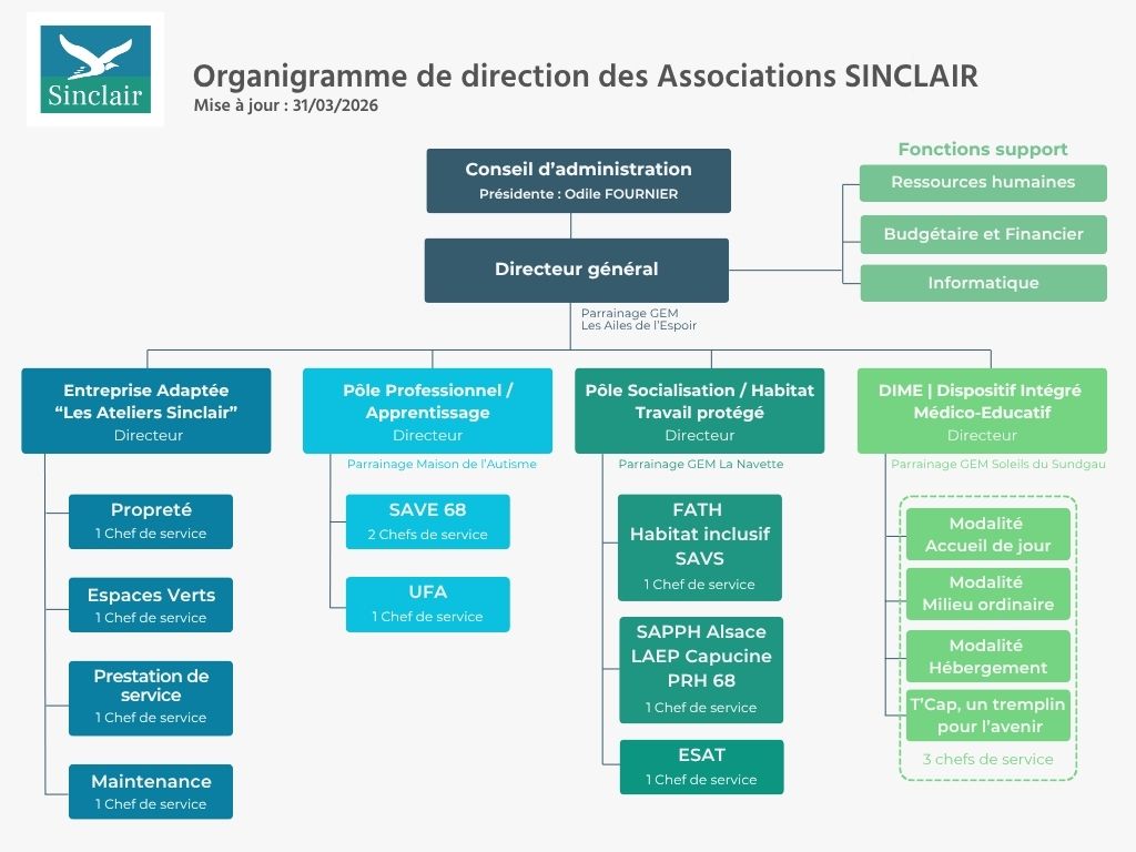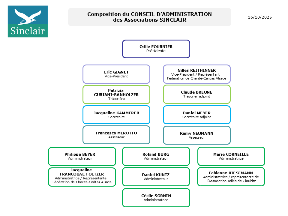 Le Conseil d’Administration des Associations Sinclair est composé de 16 membres. Sa présidente est Madame Odile Fournier. Le Conseil se réunit au moins 4 fois par an. Il est garant du projet et des valeurs de l’association. Il prend les grandes décisions de développement, d’organisation et de gestion de l’association et de ses établissements.
